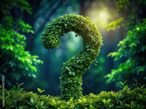 Mysterious green question marks sprout, low light illuminating an eco-conscious message.