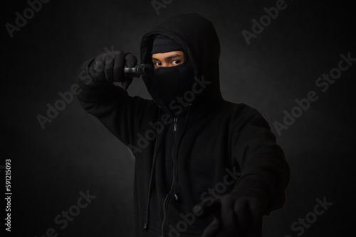 Mysterious man wearing black hoodie and mask holding a pistol, shooting with a gun. Isolated image on dark ambient background