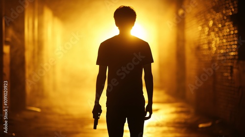 silhouette, dramatic, mysterious, figure, gun, alley, scene, backlighting, atmosphere, tension, light, shadow, suspense, action, urban, night, darkness, eerie, emotion, danger, mystery, shadowy, single, standing, loneliness, solitude, male, portrait, weapon, contrast, visual, expression, fog, street, landscape, cinematic, narrative, elusive, striking, orange, yellow, illumination, perspective, sharpened, composition, high-coloured