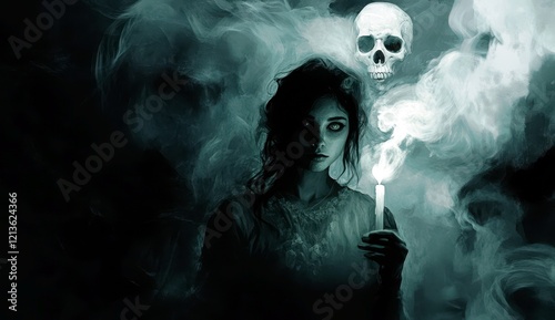 Mysterious Woman Holding Candle Surrounded by Dark Smoke and Skull Imagery in Atmospheric Halloween Scene