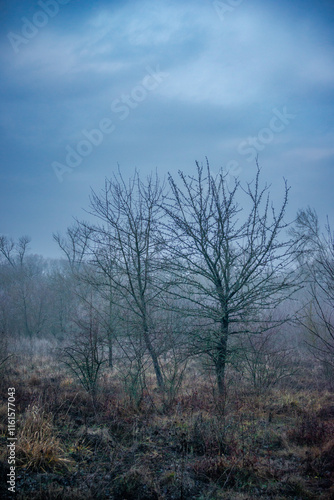 Mystery and misty weather in the forest , woodlands and trees , grey and blue colors , mystery forest , october and november weather . Beautiful landscape in the forest