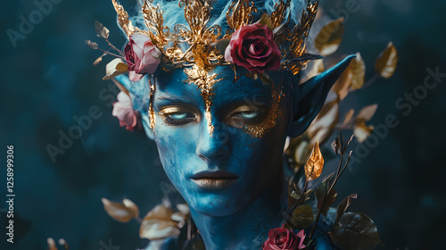 Mystical blue-skinned elf with golden crown and rose adornments. Otherworldly Carnival. Illustration