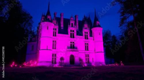 Mystical Castle Illuminated at Night: A captivating shot showcases an enchanting castle, its facade bathed in the vibrant glow of pink light against the backdrop of a twilight sky.