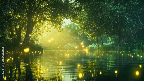 Mystical Night Forest with Bioluminescent Lights and Reflecting Water, 3D Render for Fantasy Game Environments