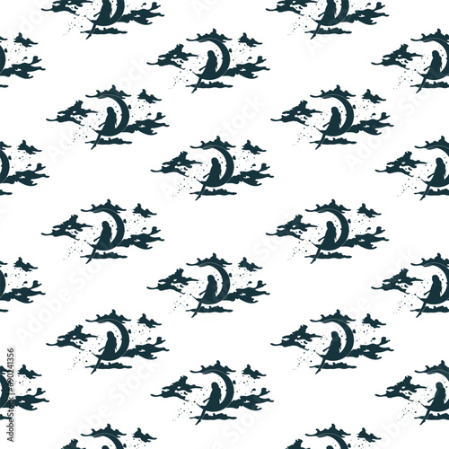 Mystical silhouette of a girl sitting on a crescent moon and surrounded by clouds. Celestial seamless pattern in boho style. Vector background for wallpaper, textile, covers and wrapping paper.