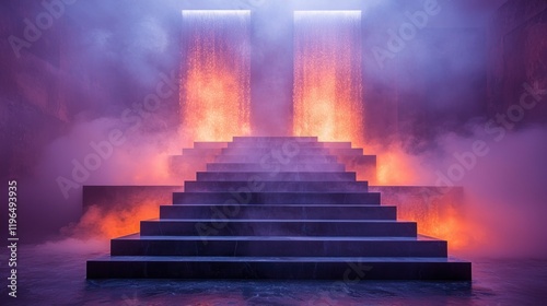 staircase, waterfall, illuminated, mystical, step, water, light, fog, atmosphere, dreamlike, fantasy, surreal, purple, orange, pink, smoke, abstract, art, design, architecture, modern, contemporary, installation, scene, setting, background, texture, shadow, dark, bright, contrast, dramatic, enigmatic, mysterious, magical, spiritual, serene, tranquil, calm, peaceful