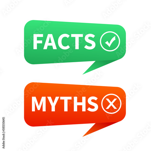 Myths, facts. Myths vs facts banners. Badges for marketing and advertising. Concept of careful fact-checking or simple comparison of evidence. Tick and cross. Pop-up web banner. Vector illustration