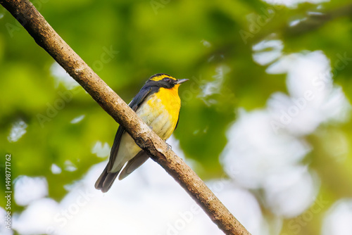新緑の林で美しくさえずる可愛いキビタキ(ヒタキ科) 英名学名:Narcissus Flycatcher, (Ficedula narcissina, family comprising the flycatchers) 新緑が美しい渓谷。 神奈川県清川村、早戸川林道-2025年