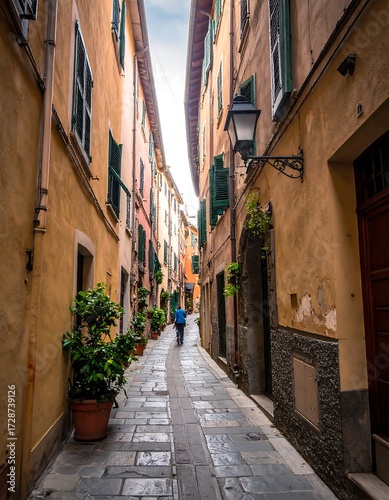 alley, narrow, town, italian, pastel, building, window, shutter, paseo, cobbled, path, light, sky, person, plant, flower, garden, architecture, travel, europa, charming, colourful, street, perspective