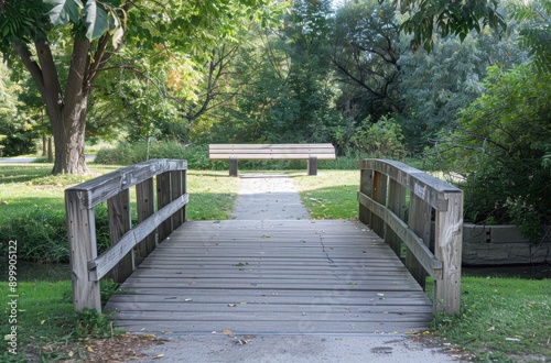 narrow rubber walkway bridge with steel frames and wooden planks over the path in the park