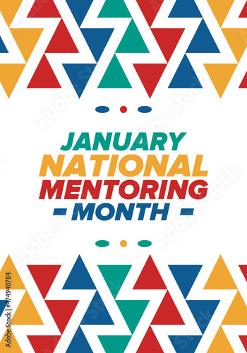 National Mentoring Month in January. Celebrate annual in United States. Personal mentor, coach or teacher. Free knowledge. Education concept. Helping a student in study, training. Vector poster