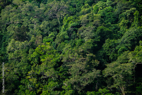 natural freshness wall of green trees that grows on the hill's slope in morning sun shine back light with some shade and shadow
