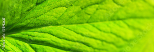 Natural green background. Plant leaf in the morning spring forest, selective focus. Horizontal banner with copy space for text