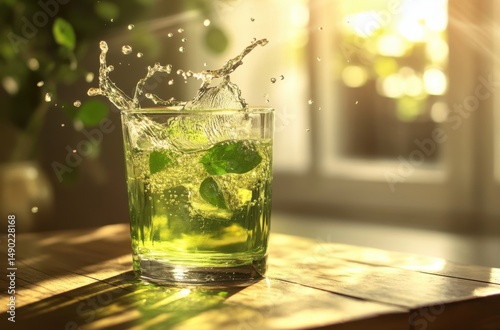 Natural green liquid splashing into a glass on wooden table by a