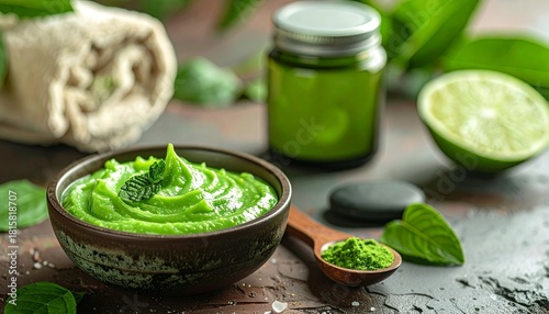 Natural Green Skincare Cream with Herbal Ingredients in Spa Setting