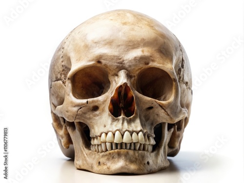 Natural Human Skull Isolated on White Background, Rule of Thirds Composition for Anatomy Studies, Medical Illustrations, Artistic Displays, and Educational Purposes