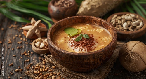 Natural kava drink served in traditional rustic bowl with assorted organic components on wood