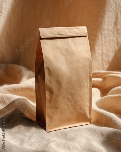 Natural kraft paper pouch standing on soft fabric background