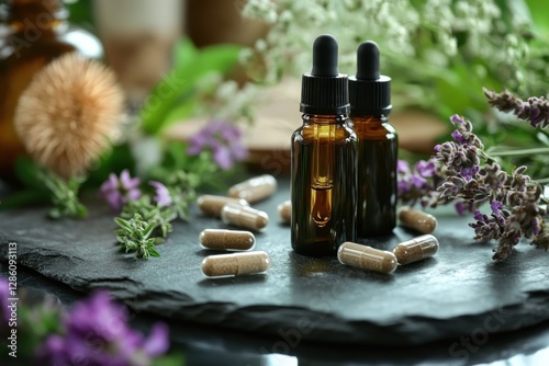 Natural remedy exploration with herbal oils and capsules on a rustic surface surrounded by fragrant flora. Generative AI