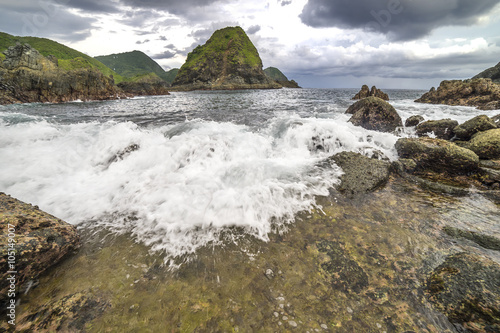 Natural rock with strong water wave and cloudy sunset background at Pantai Semeti Lombok, Indonesia.