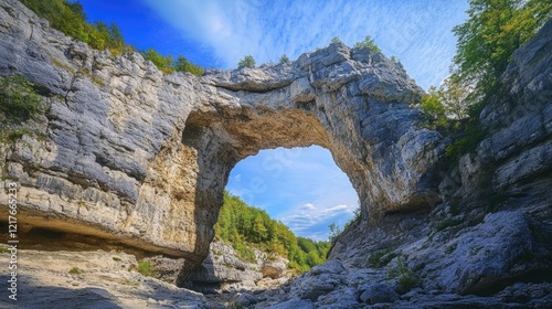 natural, stone, arch, formation, rocky, terrain, green, tree, blue, sky, copy, space, landscape, outdoors, nature, geology, canyon, rock, scenery, environment, wilderness, formation, park, travel, scenic, background, tranquil, beauty, countryside, adventure, summer, habitat, cliff, sunshine, plant, vista, erosion, elevation, foliage, tour tourism, view, panorama, surrounding, peaceful, naturalism, earth