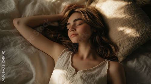 natural young woman sleeping peacefully in morning light, side-lying on bed in a cozy, relaxed pose