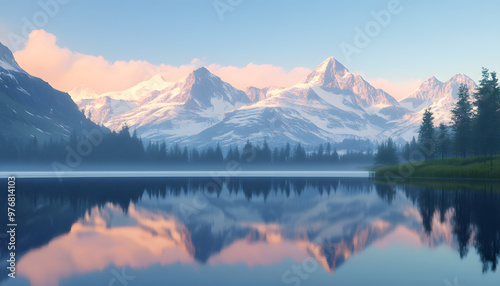 Nature Bliss: A serene mountain landscape with a lake reflecting the snowy peaks at sunrise