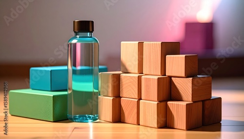 Neatly Stacked Wooden Blocks and Water Bottle on a Wooden Surface with Teal and Green Blocks and Soft Lighting