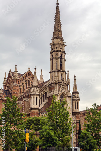 Neogothic parish church of Sant Francesc de Sales in Barcelona. The long and slender bell tower is flanked by two lateral pinnacles that reproduce in smaller scale the central tower.