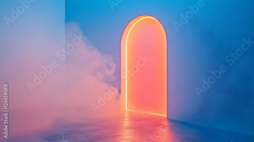 archway, neon, design, interior, modern, light, futuristic, abstract, hazy, space, room, empty, wall, colours, studio, art, background, gradient, pink, blue, fog, smoke, entrance, architecture, geometric, shape, glow, digital, graphic, image, decoration, trendy, concept, future, bright, scene