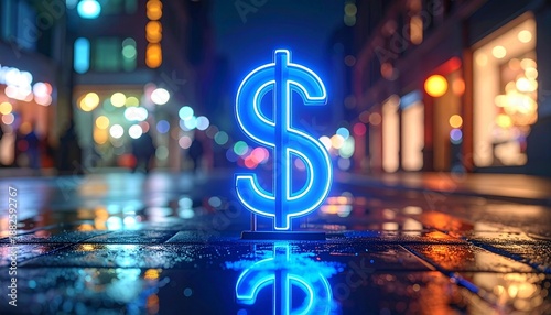dollar, signs, neon, blue, glow, city, street, wet, night, building, shop, light, bokeh, background, urban, commerce, finance, economy, symbol, modern, stylised, visual, centered, highlight, illuminated, statement, clean, minimal, edgy, graphic, design, contemporary, artistic, conceptual, texture, moody, dramatic, ambient, creative, iconic