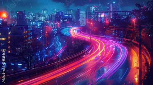 city, night, highway, rain, light, trail, neon, urban, traffic, speed, motion, blur, colourful, vibrant, futuristic, modern, technology, transportation, road, street, building, city landscape, sky, dark, abstract, background, design, illustration, artwork, graphic, digital, photo, image, picture, view, perspective, scene, element
