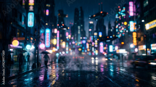city, night, rain, neon, bokeh, urban, street, light, blurred, wet, atmosphere, vibrant, colourful, dark, futuristic, metropolis, downtown, glow, moody, dramatic, people, umbrella, silhouette, steam, fog, puddle, abstract, cinematic, tranquil, dreamlike, modern, liquid, water, drop, ripple, surface, environment, background, nobody, motion, movement, car, traffic, shimmer, glistening, peaceful