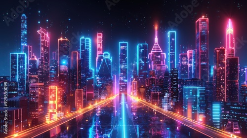 city landscape, neon, futuristic, urban, night, glow, digital, rendering, architecture, skyscraper, light, street, blue, pink, purple, orange, yellow, abstract, art, design, technology, modern, contemporary, bright, high-coloured, colourful, dynamic, graphic, geometric, style, concept, imagination, fantasy, dream, future, progress, innovation, inspiration, light, glowing, city, sky, motion, illustration, loop, space, effect, black, explosion