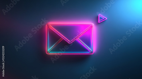 Neon glowing email envelope icon digital art abstract background 3d pink blue light shiny purple