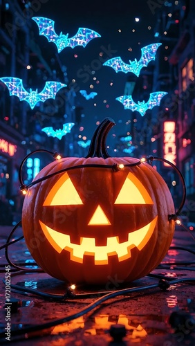 Neon Halloween Pumpkin in Cyberpunk City