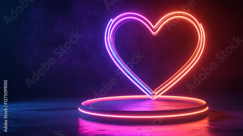 Neon heart glowing on futuristic round platform on dark room.