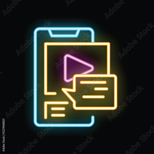 neon, icon, smartphone, mobile, phone, video, streaming, player, comment, section, social, media, engagement, online, content, digital, technology, communication, cyberspace, app, application, multimedia, entertainment, watch, view, display, screen, glowing, bright, colourful, dark, background, symbol, representation, concept, design, element, graphic, illustration, vector, isolated, black, blue, yellow, pink, purple, networking, interactive, modern