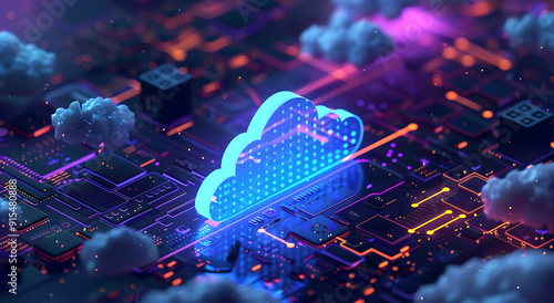 Neon light cloud computing futuristic technology and cloud storage illustration embodies network technologies cyberspace, showcasing a futuristic server in isometric perspective, dark background.