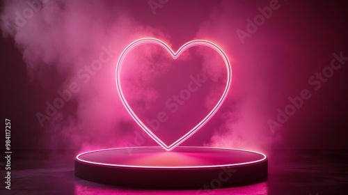 Neon lights heart with glowing platform. Podium stand for promotions Romantic themes, Valentine's day, birthday, wedding. mother's day and international women's day