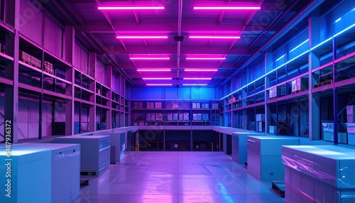 neon, lit, warehouse, mezzanine, shelving, unit, fluorescent, light, interior, space, storage, illumination, commercial, design, empty, modern, bright, colourful, industrial, facility, architecture, structure, atmosphere, technology, furniture, organisation, ambient, high-coloured, line, shelf, layout, clean, visual, workspace, lighting, contrast, material, view, arrangement, calm, open, geometric, pattern, decor, scene, aesthetic, innovation, beauty