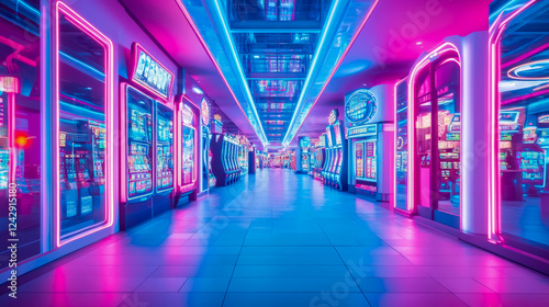 glow, dazzling, striking, ceiling, reward, blue, colourful, illusion, fun, futuristic, play, arcade, aesthetic, alluring, game, illumination, interior, floor, light, chance, gambling, glowing, captivating, risk, corridor, dreamlike, high-coloured, intense, enigma, machine, pink, electric, hypnotic, showy, vibrant, mesmerizing, atmosphere, architecture, neon, space, bright, excitement, fantasy, entertainment, modern, leisure