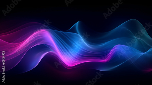Néon ondulé coloré, bleu et rose, sur fond noir et sombre. Effet texturé transparent, flou et électrisant. Vague en mouvement. Conception graphique, bannière etc.