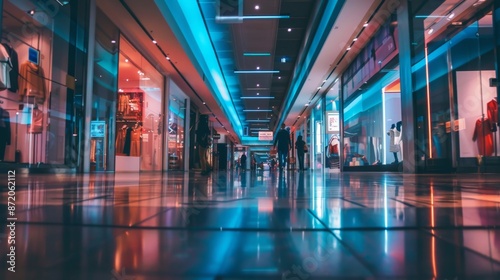 shopping centre, mall, modern, architecture, interior, neon light, light, blue light, red light, tiled floor, retail, business, commercial, consumerism, city, urban, people, couple, shopping, client, consumer, shopper, lifestyle, style, trend, fashion, design, modern architecture, minimalist, clean, bright, vibrant, atmosphere, mood, nightlife, evening