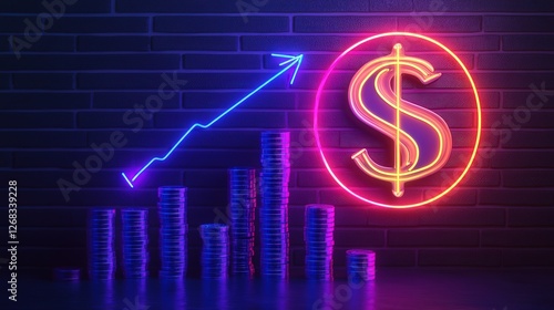 neon sign illustrating growing savings, symbolized by rising coins, a measurement tool marking the increase, and a glowing dollar symbol.