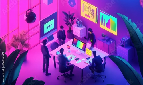 neon, office, meeting, collaboration, teamwork, brainstorming, workspace, digital, technology, design, futuristic, modern, colourful, vibrant, graphic, datum, analysis, presentation, illustration, three-dimensional, render, concept, creative, style, abstract, trend, aesthetic, minimalist, artwork, art