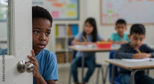 nervous, children, classroom, door, inclusive, editorial, realism, hesitant, peeking, school, student, doorway, modern, hand, blurred, background, soft, ambient, light, education, emotion, anxiety, hesitation, young, learning, indoor, frontal, entrance, body language, facial expression, back to school, candid, diverse, youth, childhood, observation, subtile, vulnerability, elementary, children, waiting, feeling, tenderness
