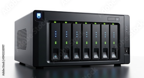Network attached storage device with multiple hard drive bays. Server equipment for data backup and cloud computing. Hardware for enterprise database management and computer technology.