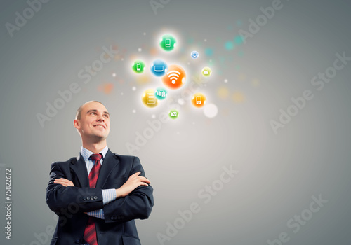 media, cloud, businessman, wireless, display, social, application, connect, smartphone, device, male, touch screen, networking, icon, symbol, cyberspace, finger, digital, technology, touch, computer, network, net, connection, pad, push, app, computing, multimedia