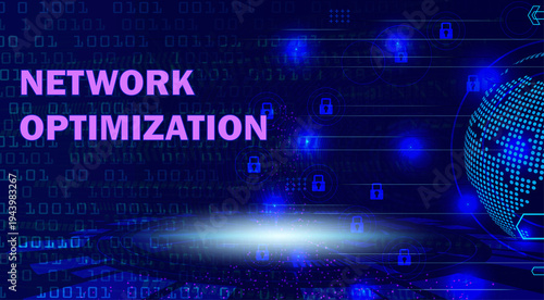 Network Optimization concept with glowing purple text, binary code, abstract digital globe, and padlock icons on a dark blue background, ideal for technology banners and presentations.